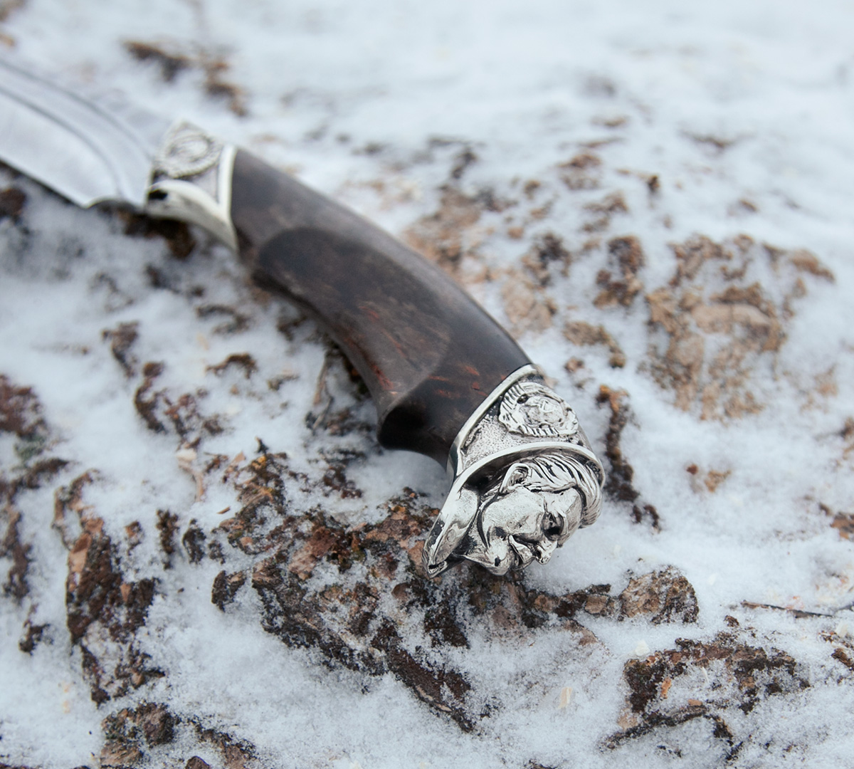 Нож Клыч из дамасской стали с художественным оформлением, рукоять - стабилизированная карельская береза, кожаный чехол идет в комплекте.