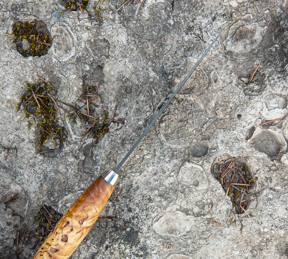 Нож Ладья из булатной стали, рукоять - стабилизированная карельская береза, кожаный чехол идет в комплекте.