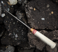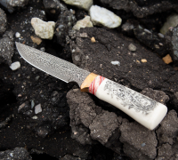 Нож Гефест из мозаичной дамасской стали, рукоять - клык моржа, зуб мамонта, мокуме, скримшоу. Формованный чехол идет в комплекте.