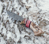 Нож Гефест из мозаичной дамасской стали, рукоять - рог лося (выжигание на кости), вставка - зуб мамонта, кожаный чехол идет в комплекте