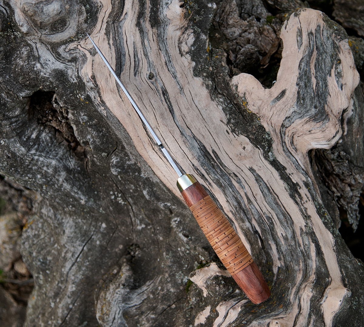 Нож Гефест из кованой нержавеющей стали 110х18, рукоять - бубинга + береста, кожаный чехол идет в комплекте.