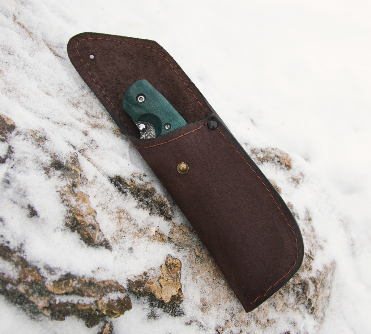 Нож складной Сибиряк из ламинированной стали, рукоять - стабилизированная карельская береза, кожаный чехол идет в комплекте.