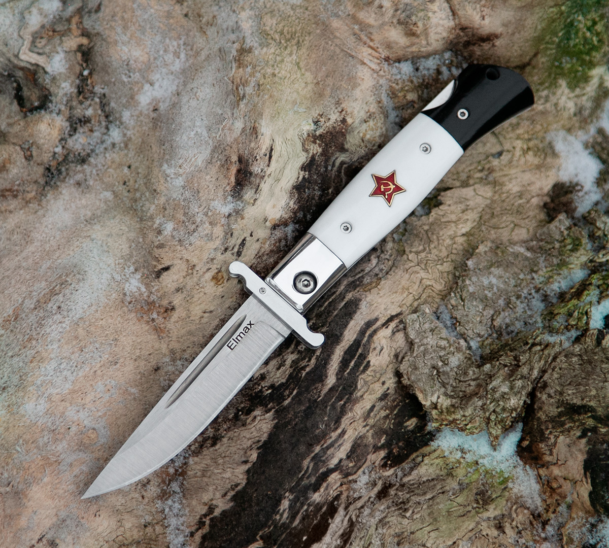 Складная Финка-мини из порошковой нержавеющей стали Elmax, рукоять - акрил, кожаный чехол идет в комплекте.